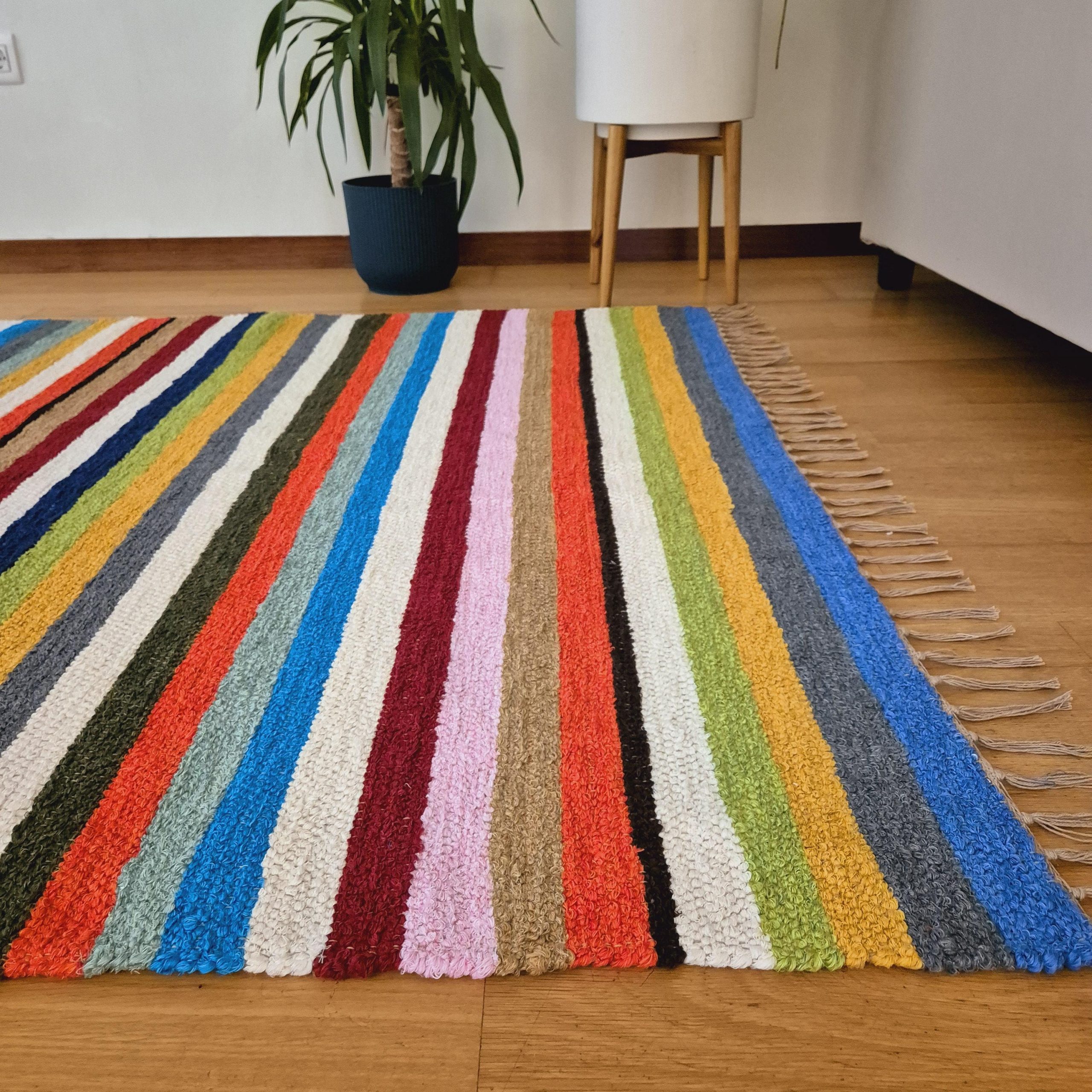 This rug is woven in a manual loom with fabrics reused from textile factories.