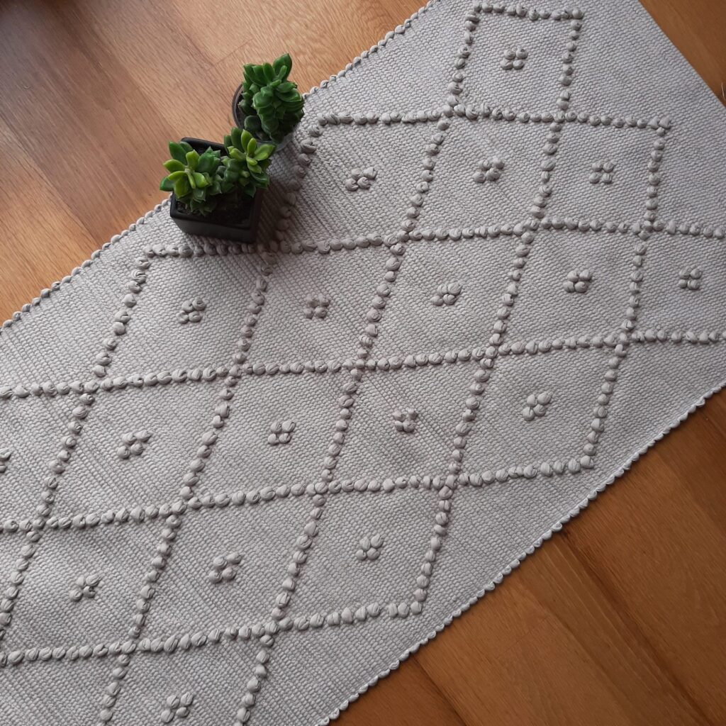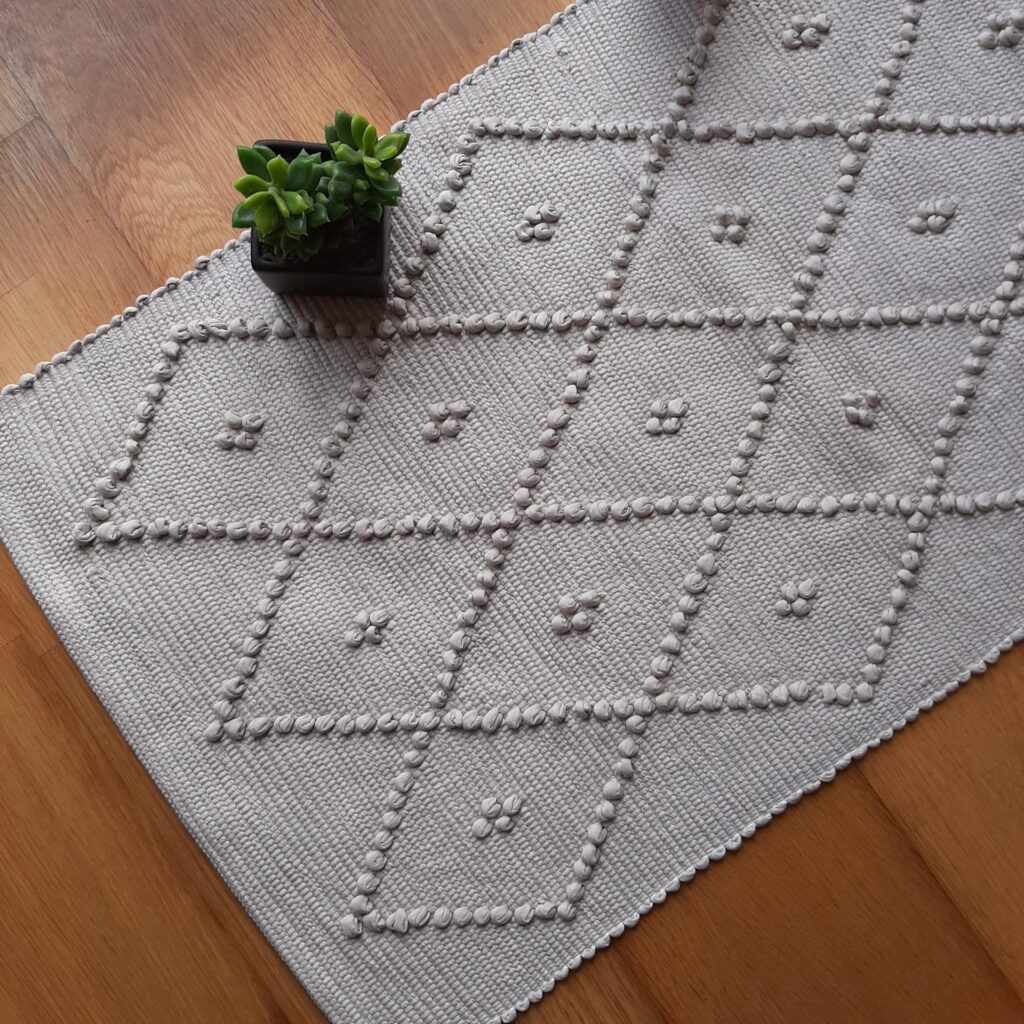 These rugs are beautiful! I love how the woven fabric looks and a fantastic price for how lovely they are. Perfect hallway runner and bathmats. Highly recommend. I got the dark and pine green colours.