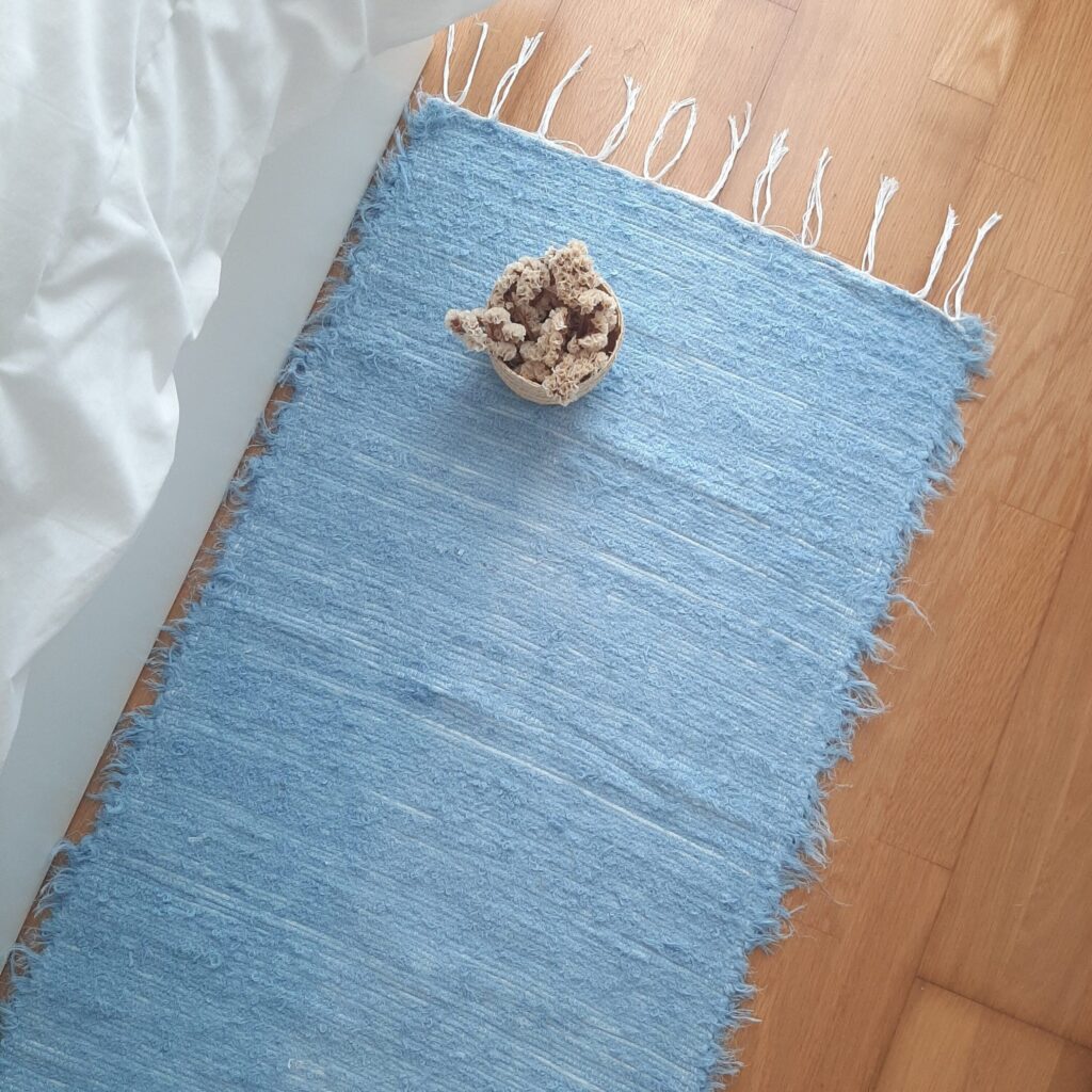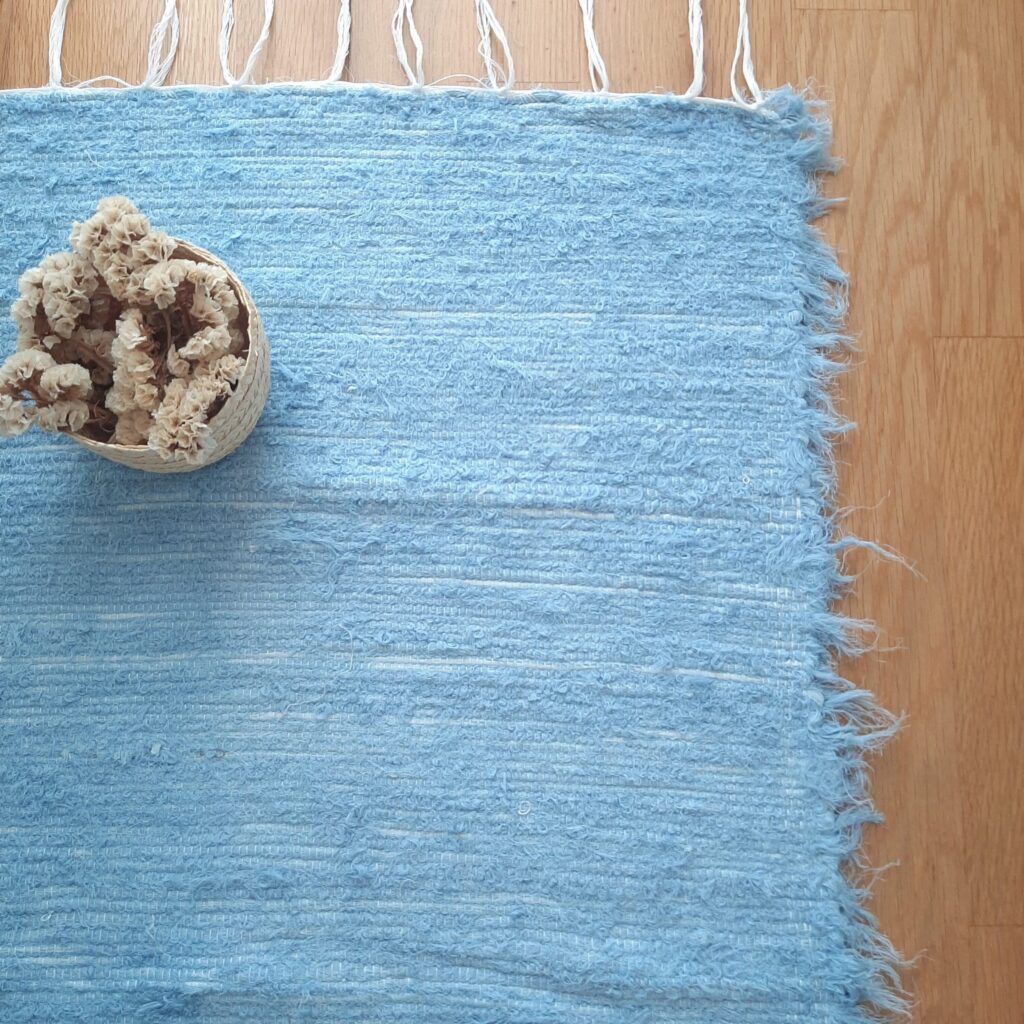 Este tapete é tecido num tear manual com tecidos reutilizados.