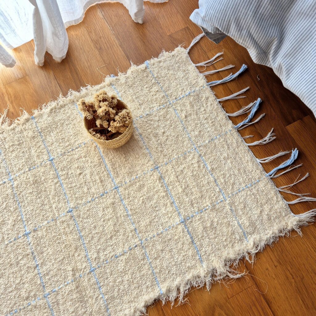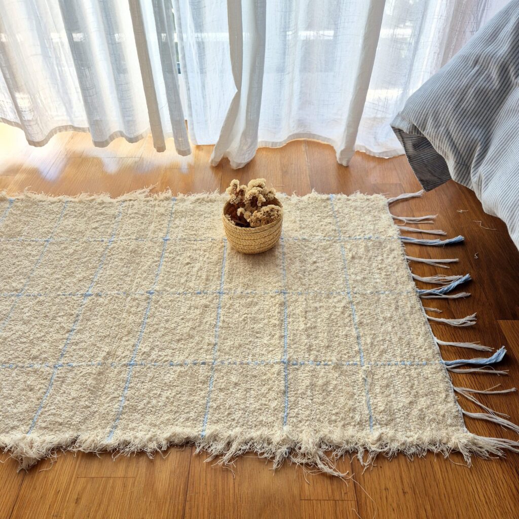 Este tapete é tecido num tear manual com tecidos reutilizados de fábricas têxteis.