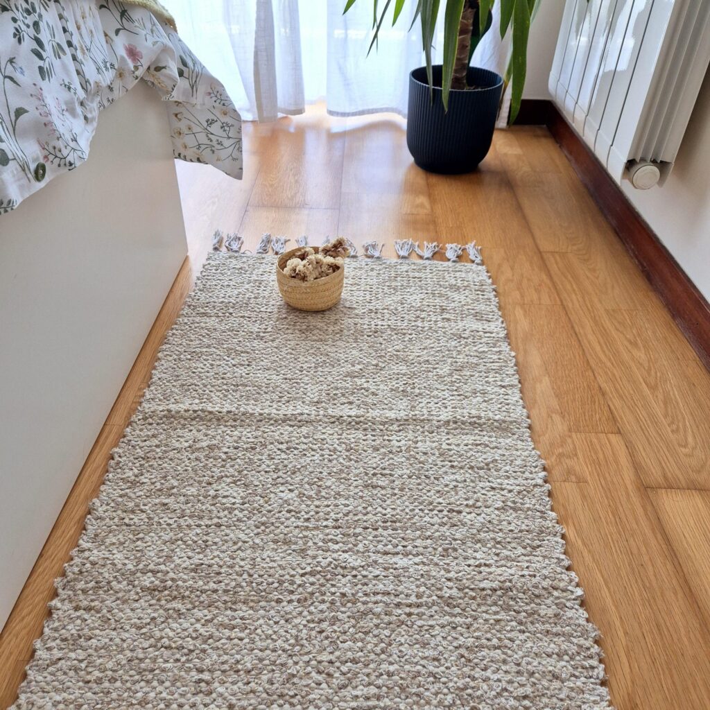 Este tapete é tecido num tear manual com tecidos reutilizados de fábricas têxteis.