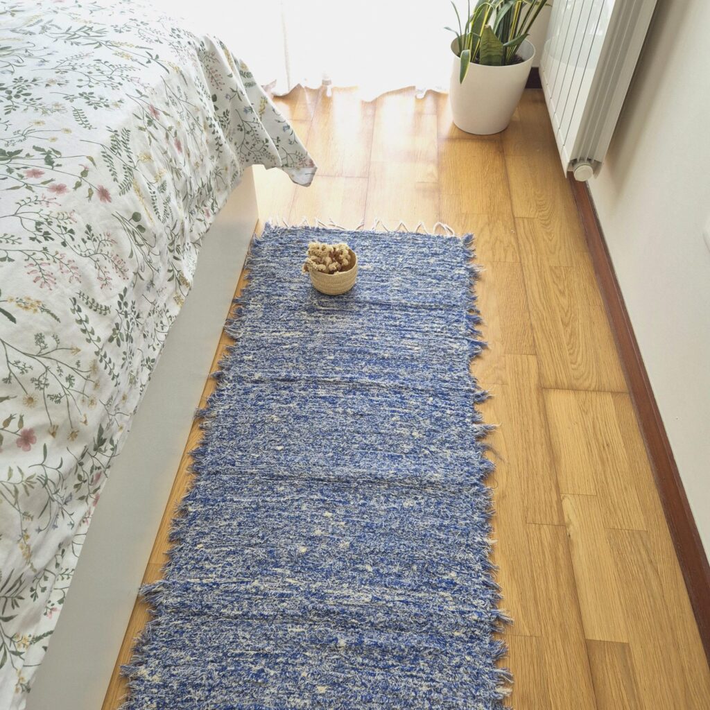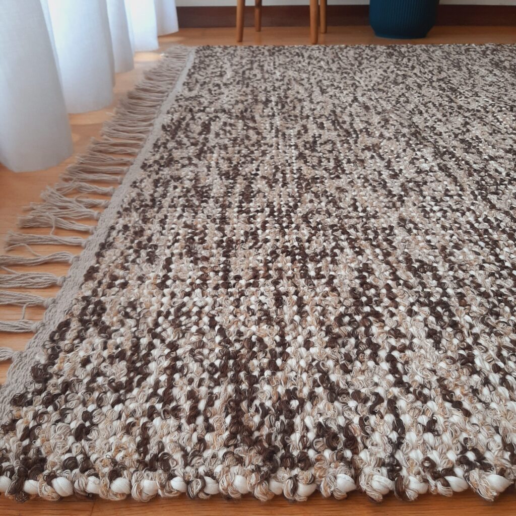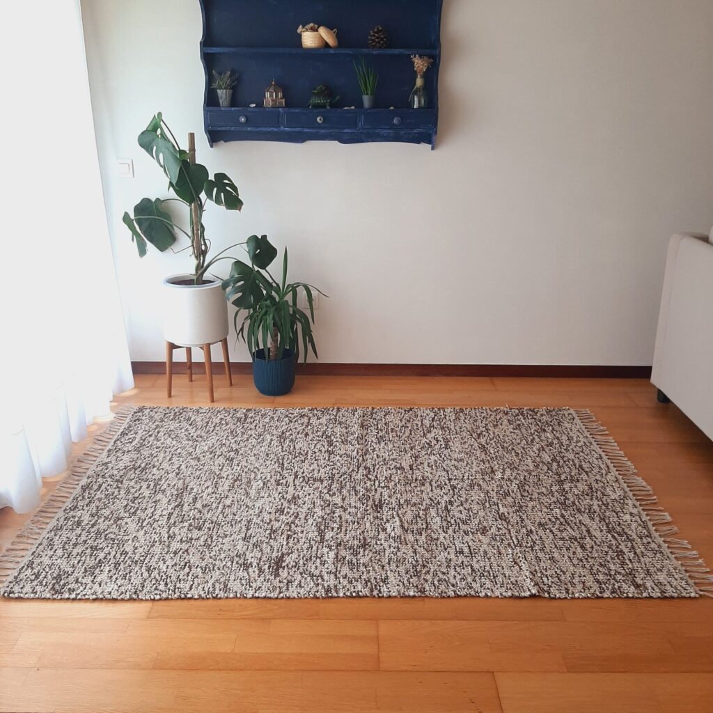 Este tapete é tecido num tear manual com tecidos reutilizados.