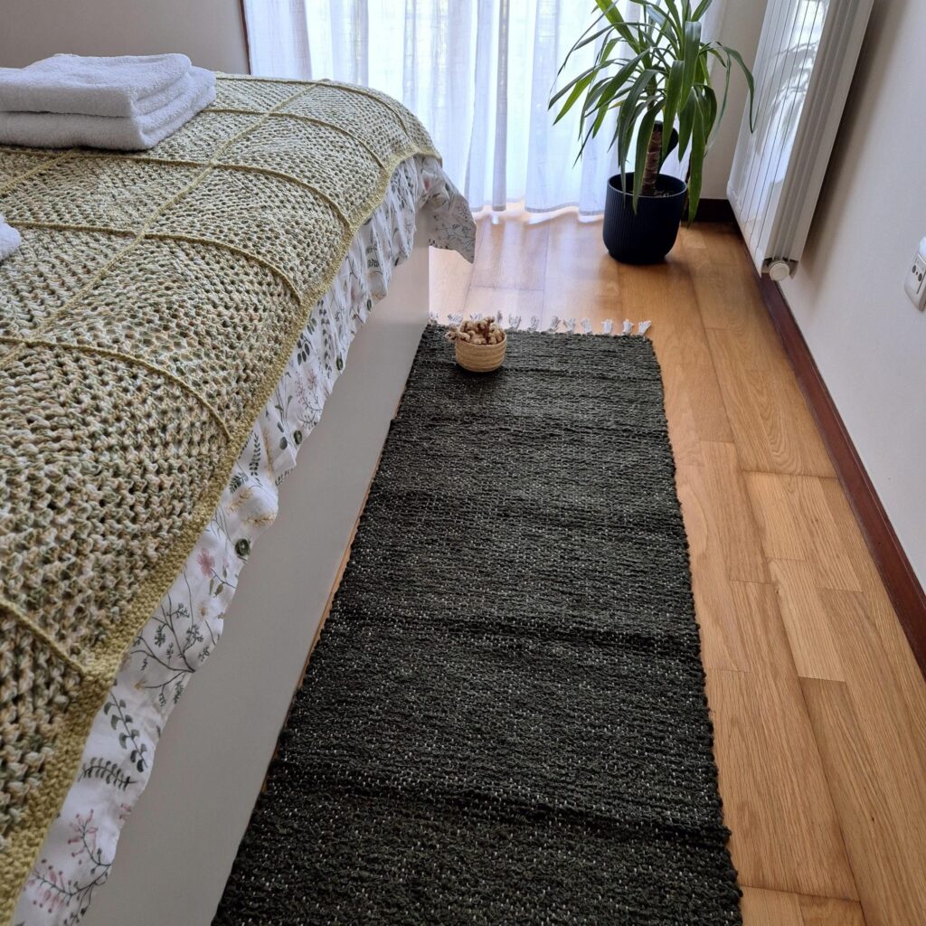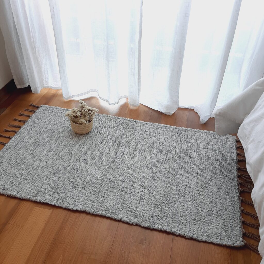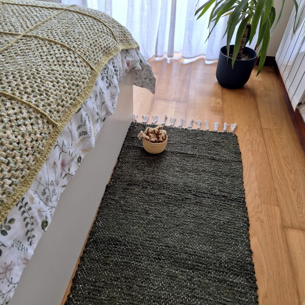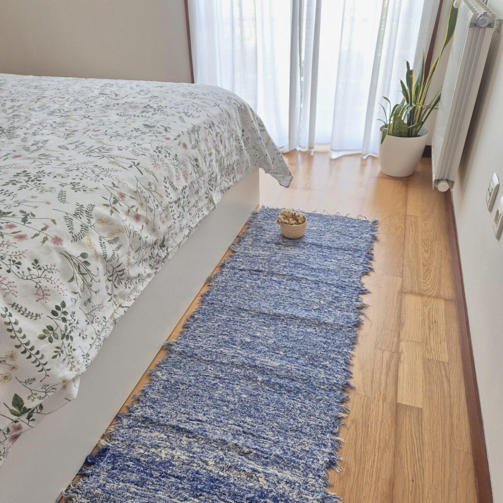 Este tapete é tecido num tear manual com tecidos reutilizados.