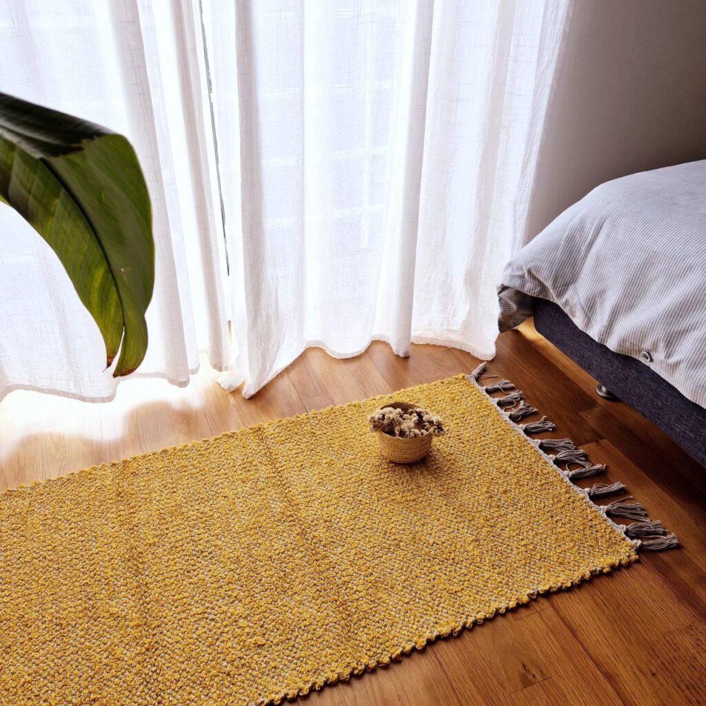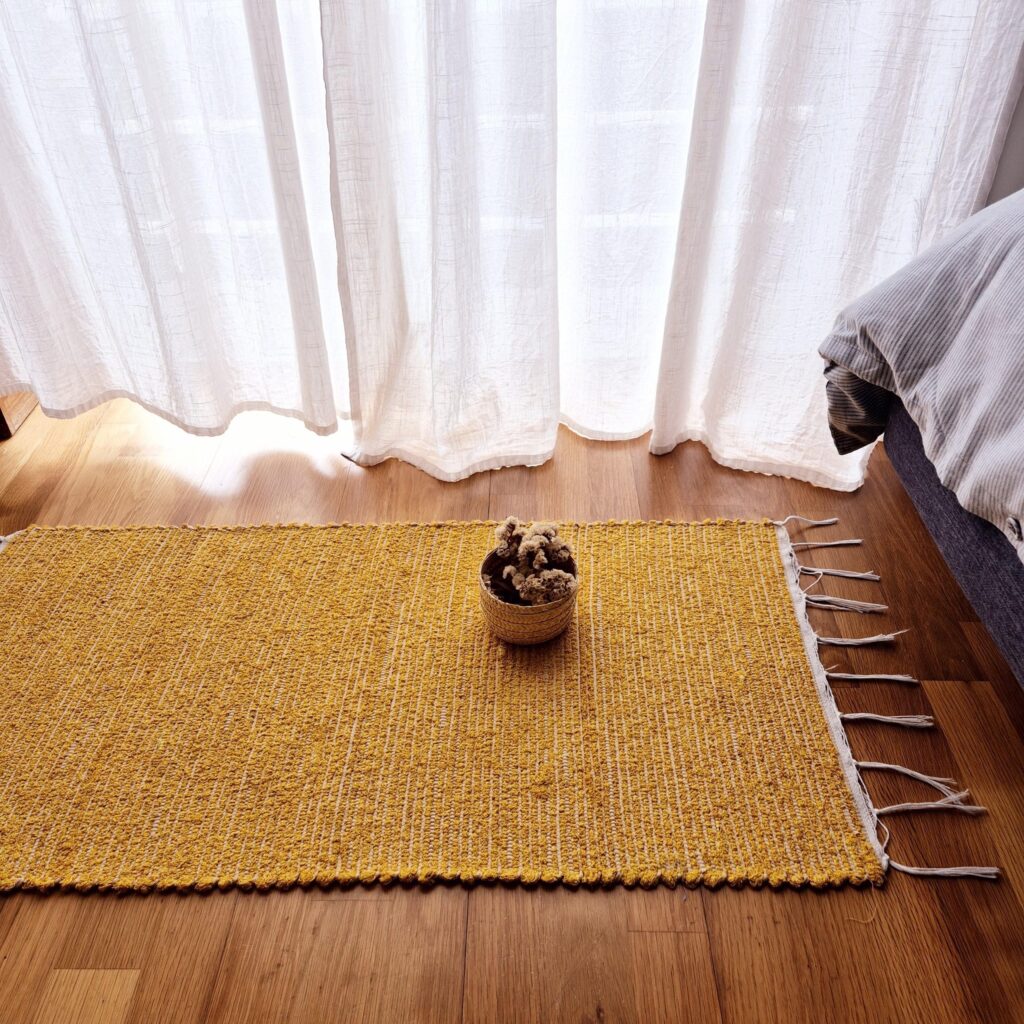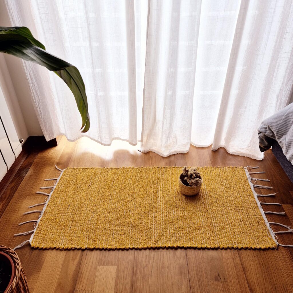 Este tapete é tecido num tear manual com tecidos reutilizados.