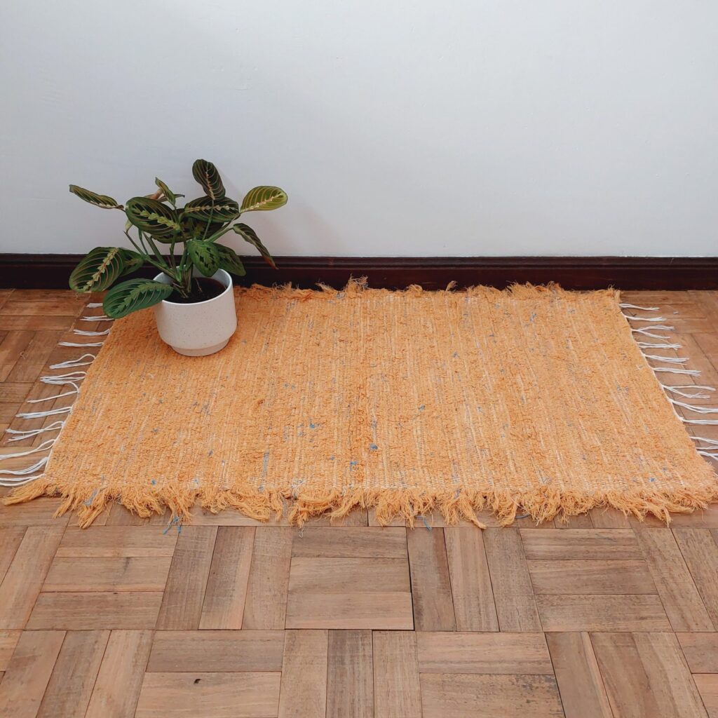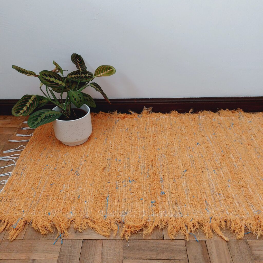 Este tapete é tecido num tear manual com tecidos reutilizados.