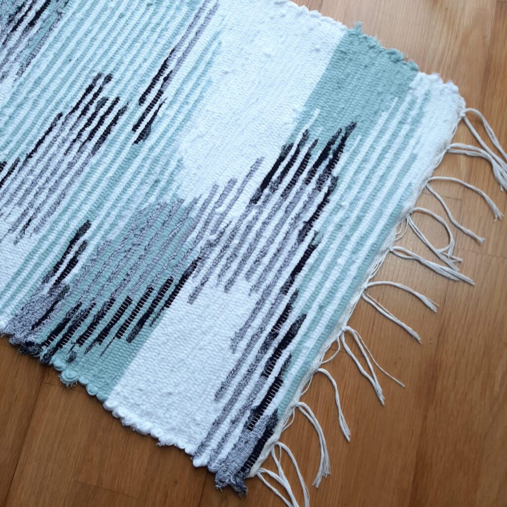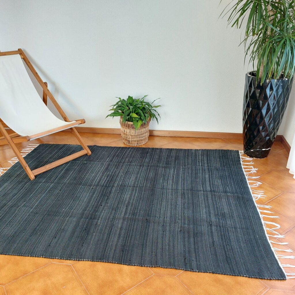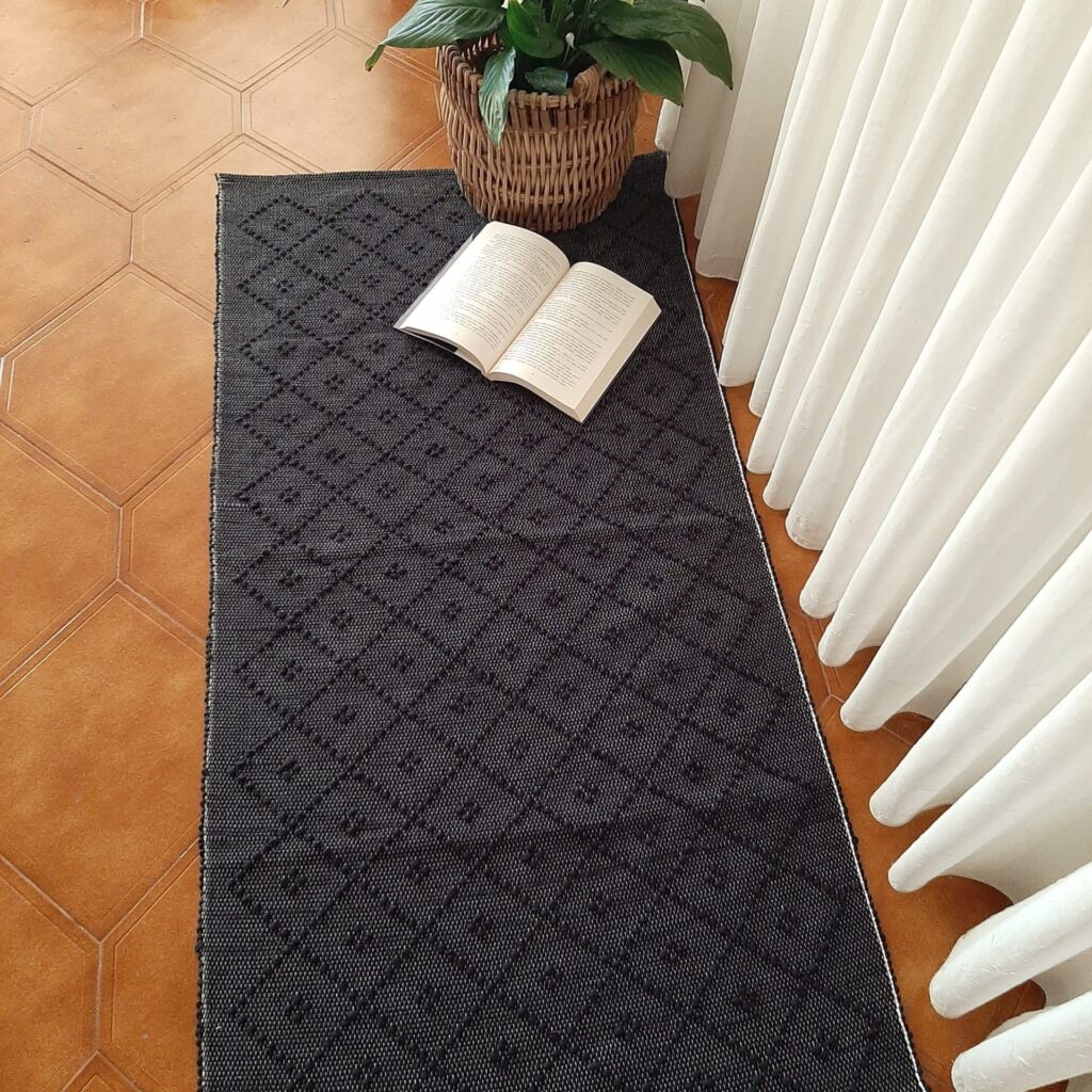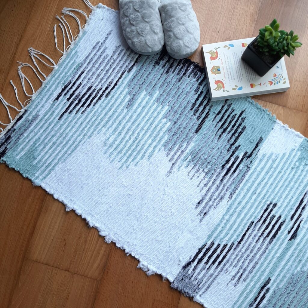 Este tapete é tecido num tear manual com tecidos reutilizados.