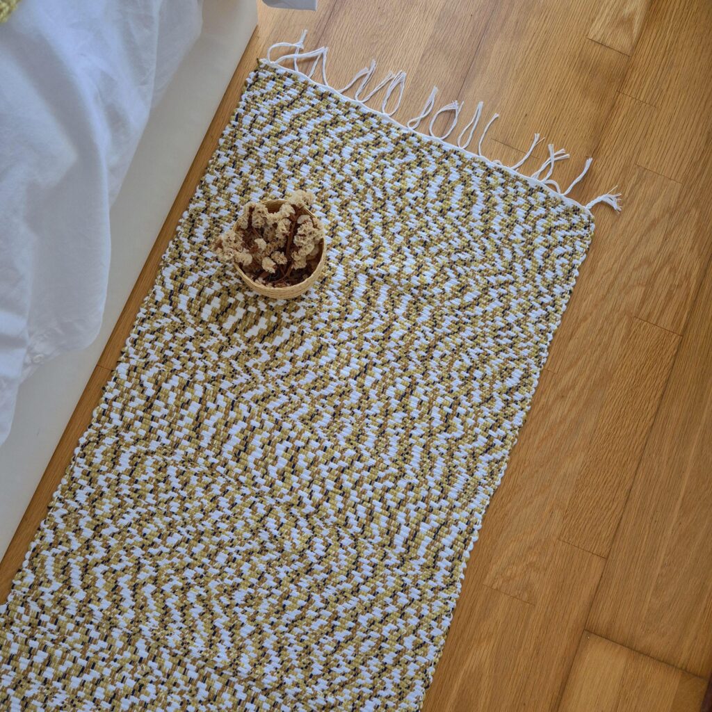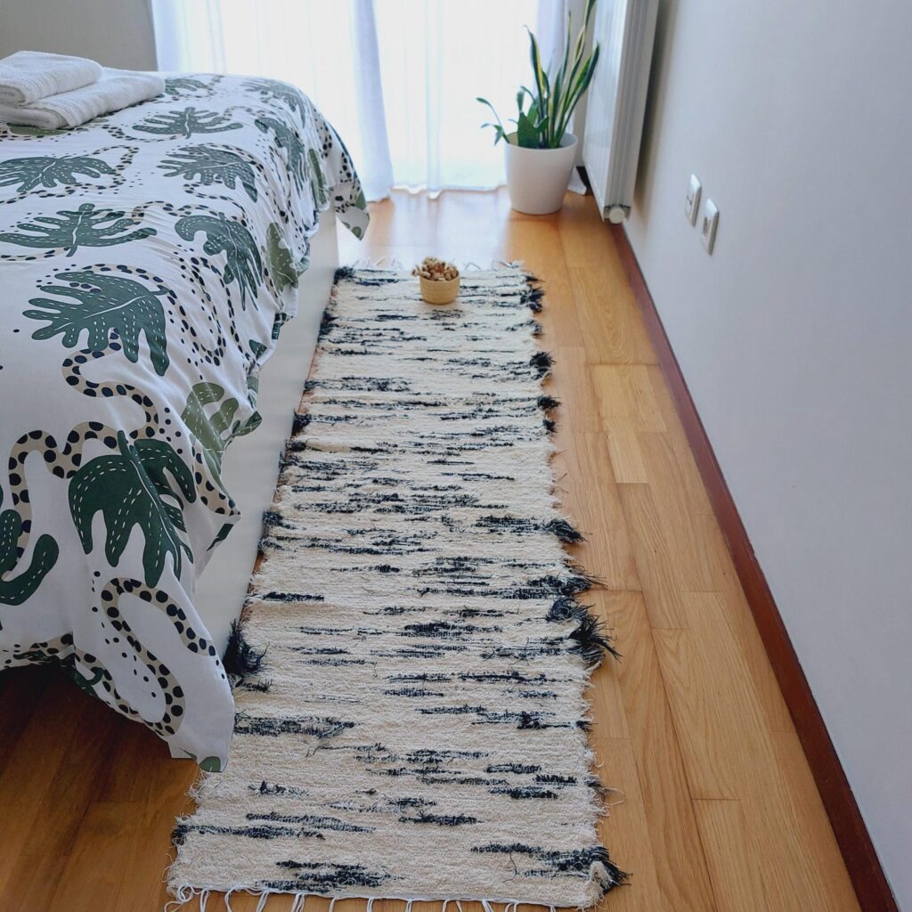 Este tapete é tecido num tear manual com tecidos reutilizados.