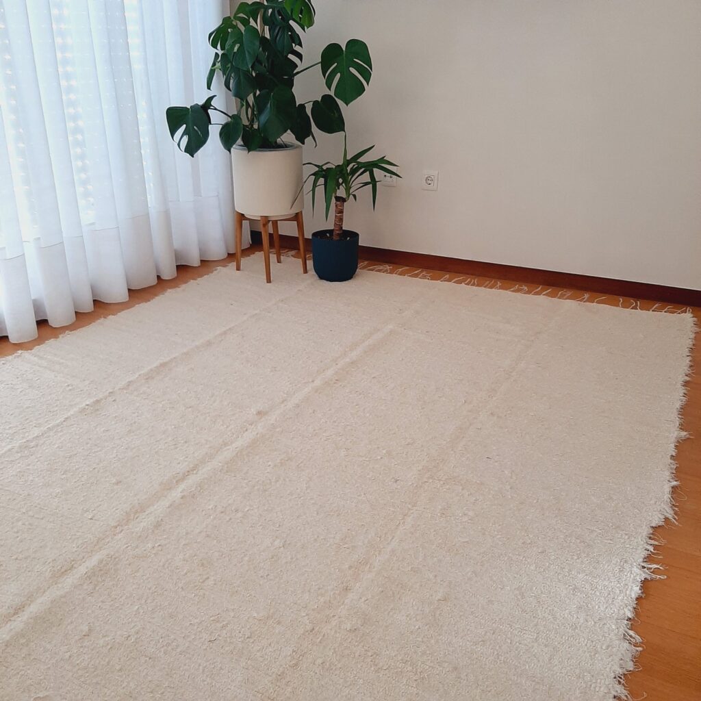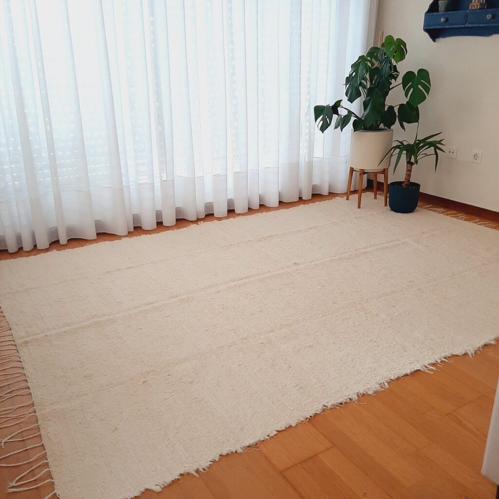 Este tapete é tecido num tear manual com tecidos reutilizados.