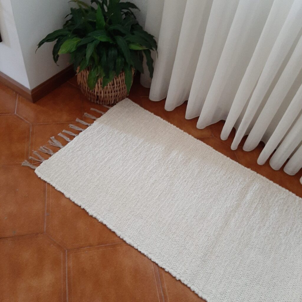 Este tapete é tecido num tear manual com tecidos reutilizados.