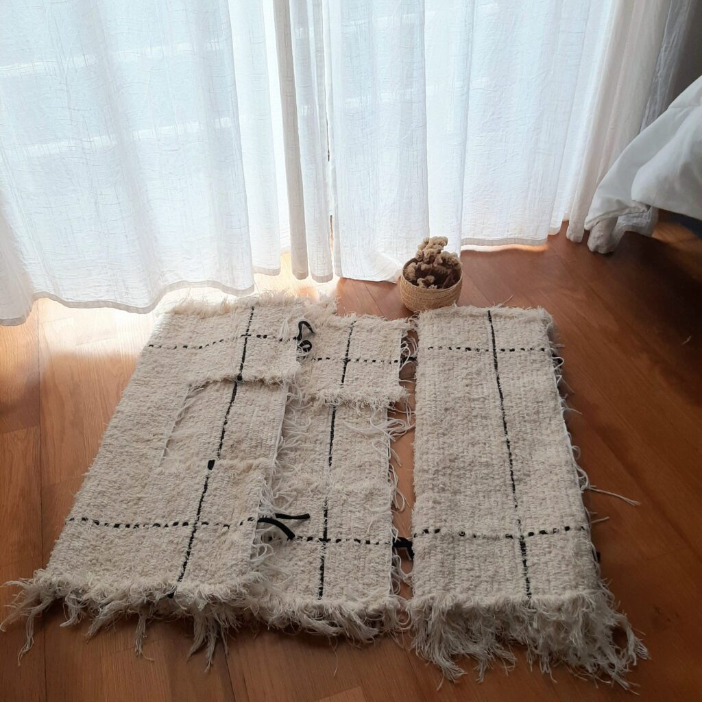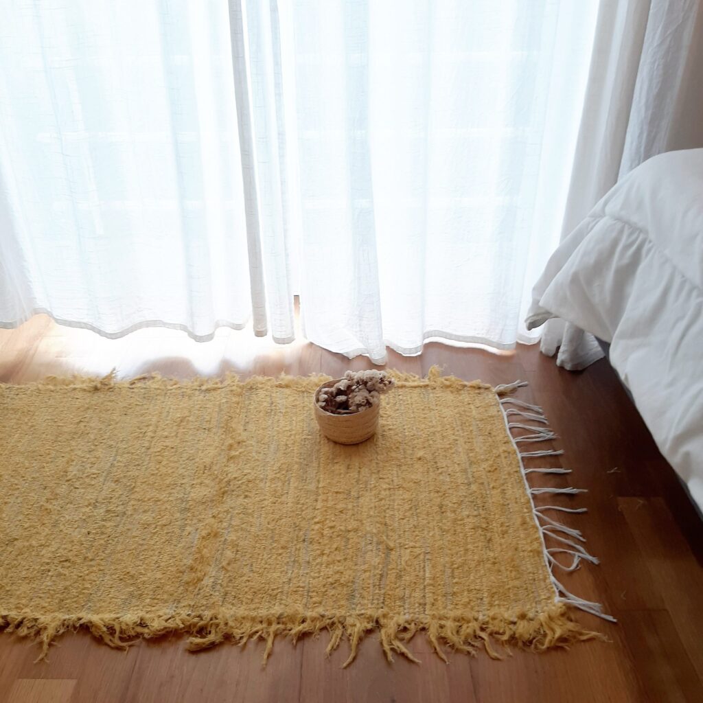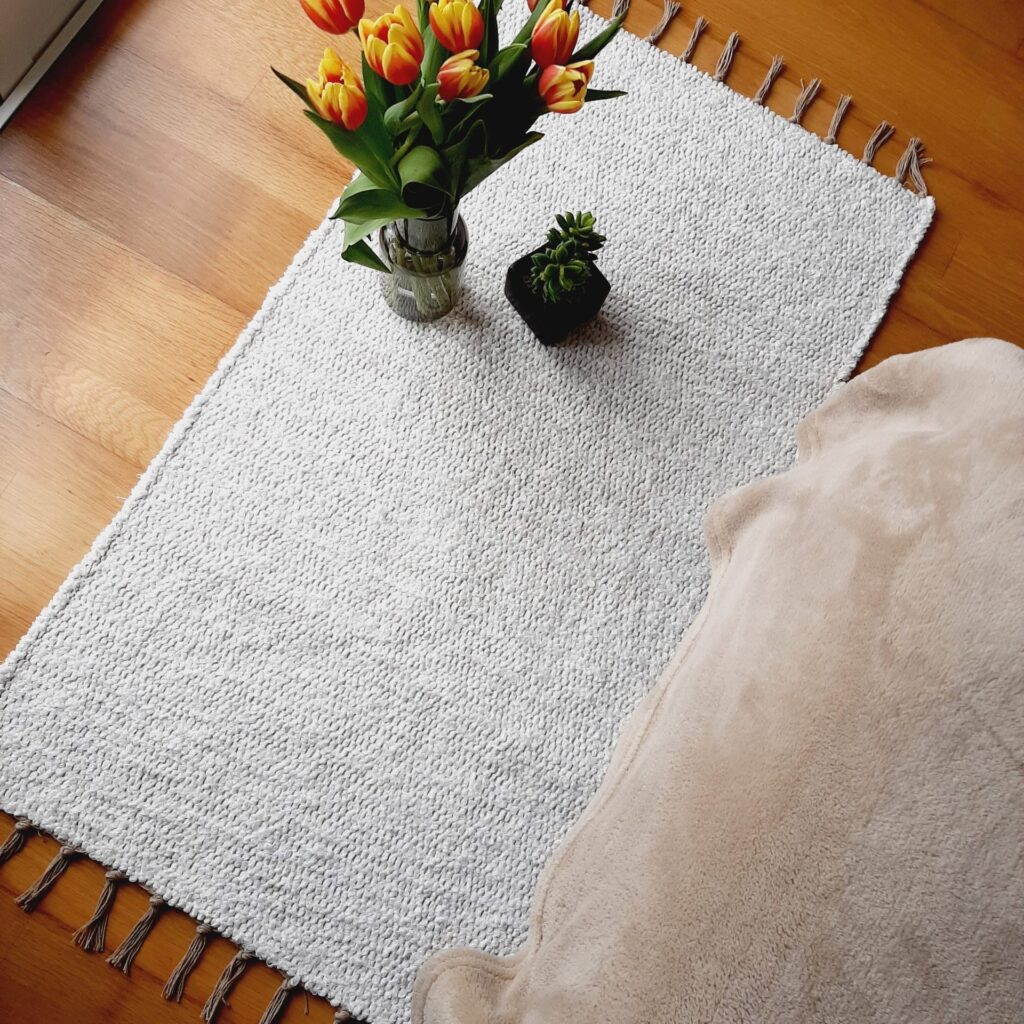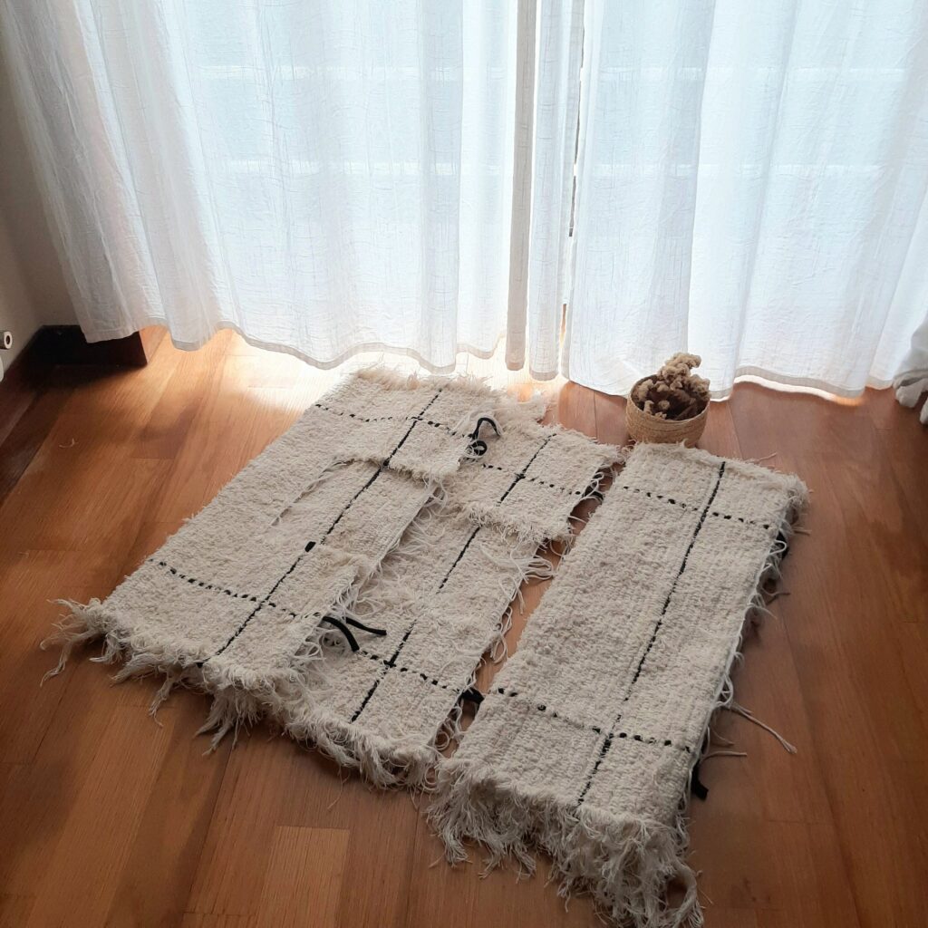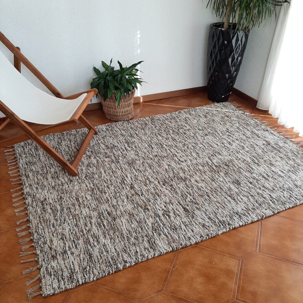 Este tapete é tecido num tear manual com tecidos reutilizados.