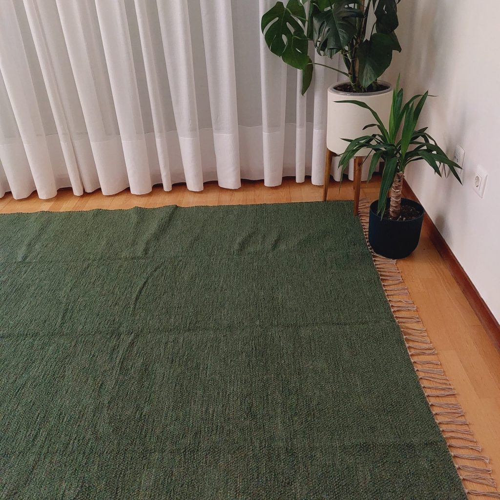 Este tapete é tecido num tear manual com tecidos reutilizados.
