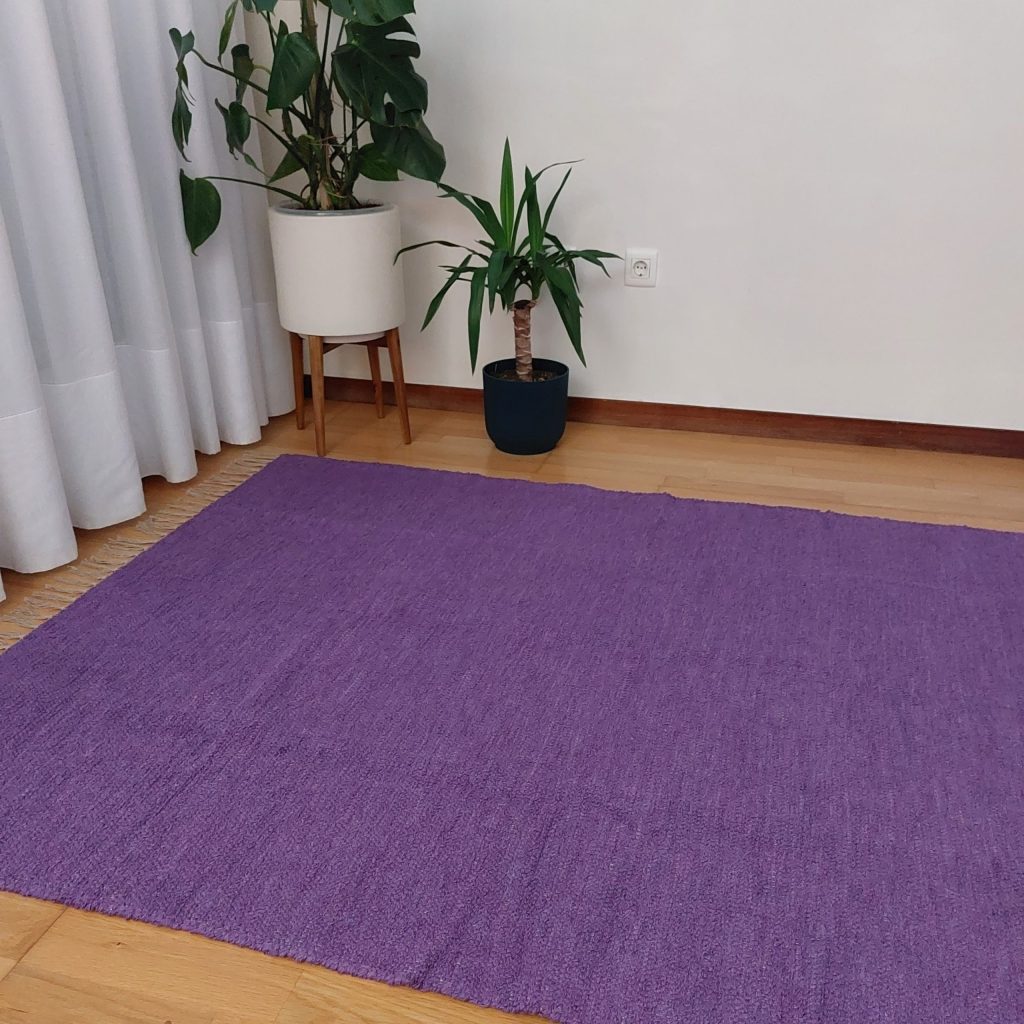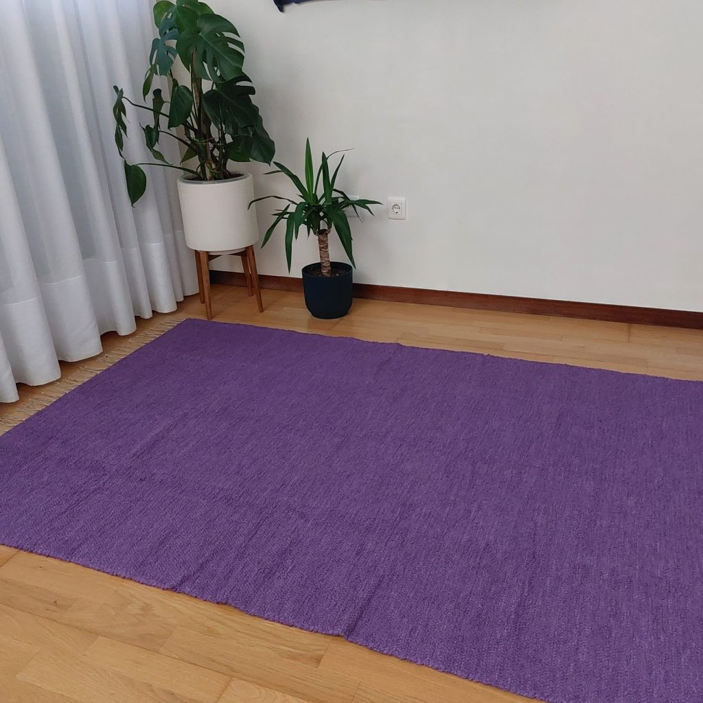 Este tapete é tecido num tear manual com tecidos reutilizados.